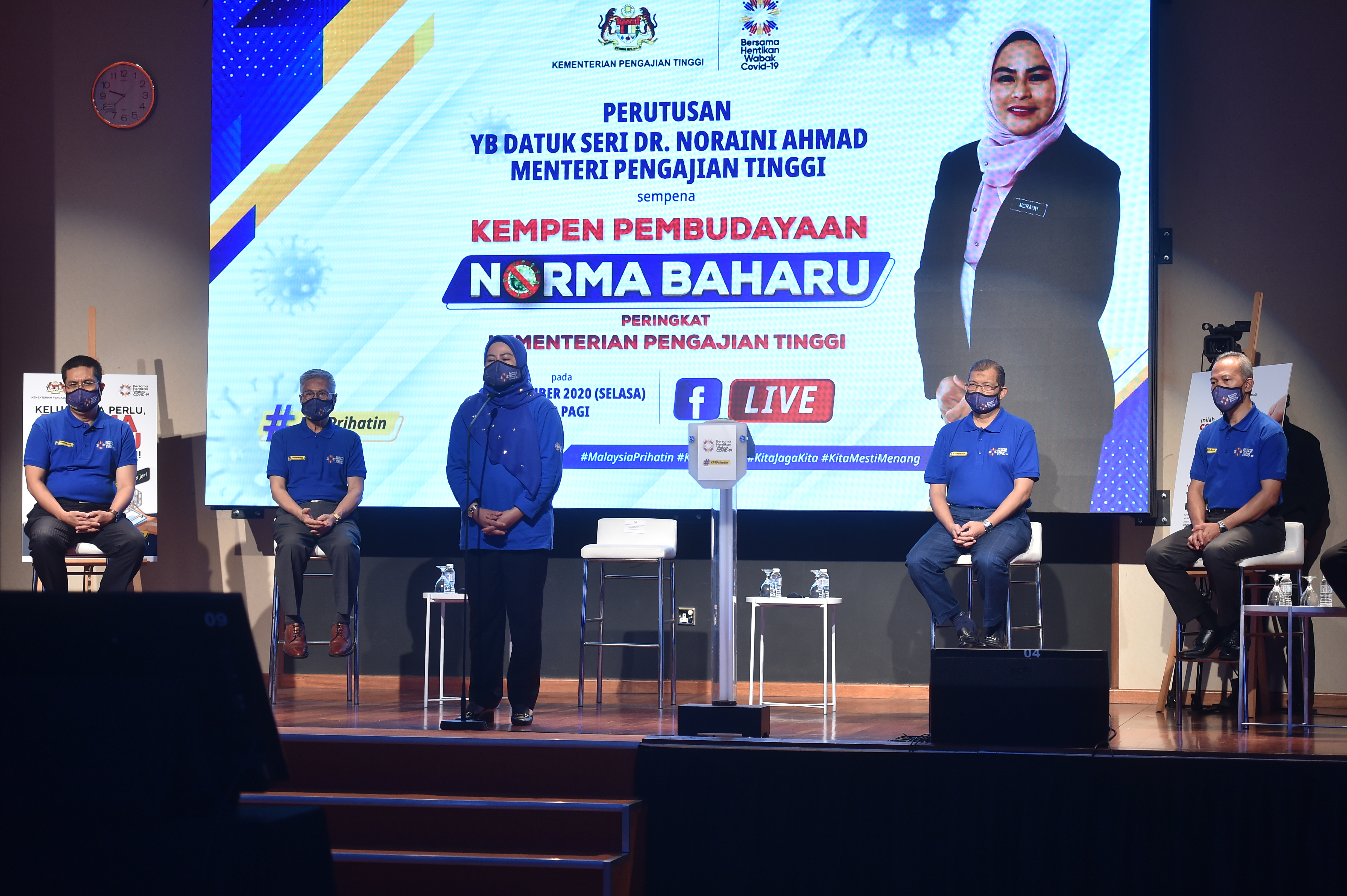 17 November 2020, YB Datuk Seri Dr. Noraini Ahmad, Menteri Pengajian Tinggi telah menyampaikan perutusan sempena Kempen Pembudayaan Norma Baharu Kementerian Pengajian Tinggi secara dalam talian hari ini. Kempen ini bertujuan untuk meningkatkan kesedaran dan memperkasa komuniti bagi melindungi diri, keluarga dan komuniti masing-masing dalam usaha memerangi pandemik COVID-19 dan membudayakan norma baharu. Program ini turut disertai oleh para pelajar institusi pendidikan tinggi di seluruh Malaysia secara dalam talian. Turut serta YB Dato' Mansor Othman, Timbalan Menteri Pengajian Tinggi, Datuk Seri Dr Mazlan Yusoff, Ketua Setiausaha KPT, Dr Mohd Zabri Yusoff, Timbalan Ketua Setiausaha (Dasar) KPT, Datuk Rosli Yaakub, Timbalan Ketua Setiausaha (Pengurusan dan Pembangunan) KPT, Prof Datuk Seri Dr Mohamed Mustafa Ishak, Ketua Pengarah Pendidikan Tinggi dan Ts Haji Mohamad Amin Hamat, Timbalan Ketua Pengarah (Governan) yang menjalankan tugas Ketua Pengarah Jabatan Pendidikan Politeknik dan Kolej Komuniti.