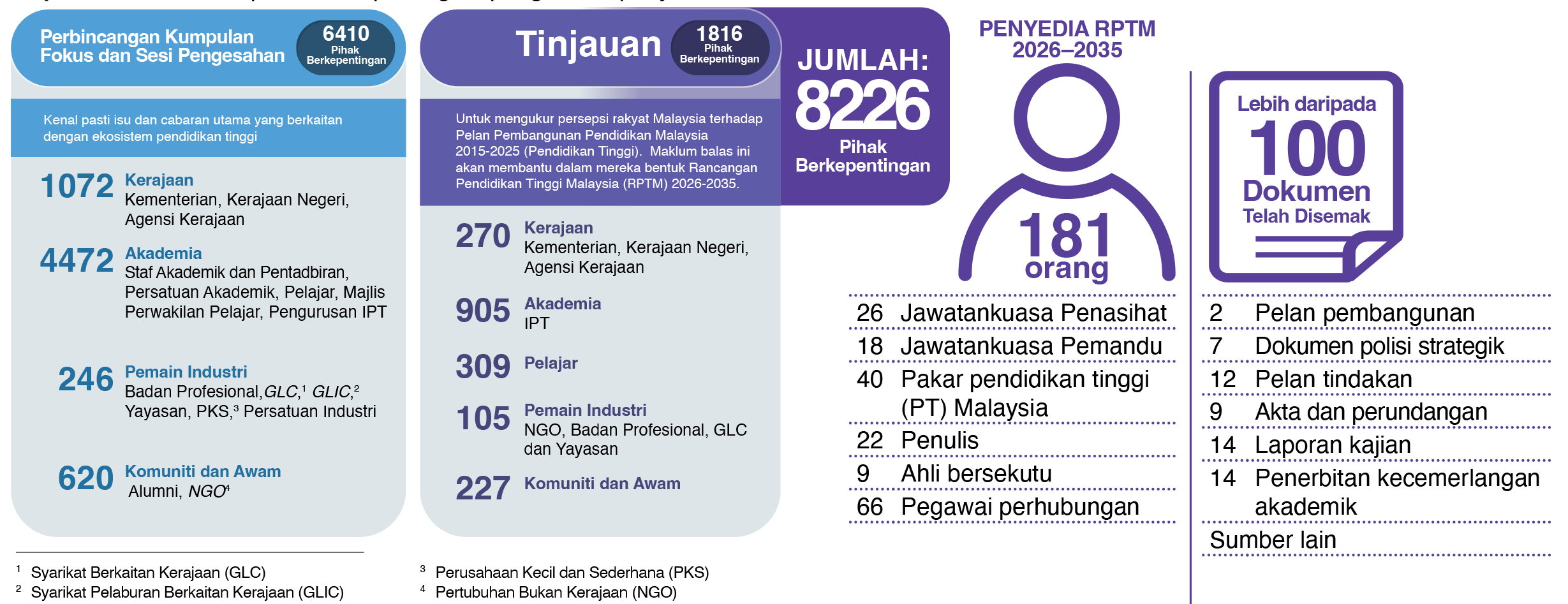 Rancangan Pendidikan Tinggi Malaysia 2026–2035 atau RPTM 2026–2035 dibangunkan melalui proses kolaboratif dan perundingan yang dipacu oleh pemikir terkemuka Malaysia dengan lebih 8,000 pihak berkepentingan dan individu yang terlibat dalam memberikan input dan maklum balas. Pihak berkepentingan yang terlibat termasuklah pakar pendidikan Malaysia dan global, pentadbir universiti, lembaga universiti, komuniti akademik, kesatuan dan persatuan, staf kementerian, badan industri dan majikan, agensi berkaitan, ibu bapa, pelajar dan orang awam. Proses pembangunan bermula dengan semakan komprehensif prestasi semasa melalui pemerhatian, pengumpulan data, tinjauan dan penglibatan pihak berkepentingan. Pemerhatian melibatkan analisis sebanyak lebih 100 buah dokumen, termasuklah analisis terperinci tentang PPPM 2015–2025 (PT). Tiga fasa berbeza dalam pembangunan RPTM 2026–2035 adalah seperti berikut: