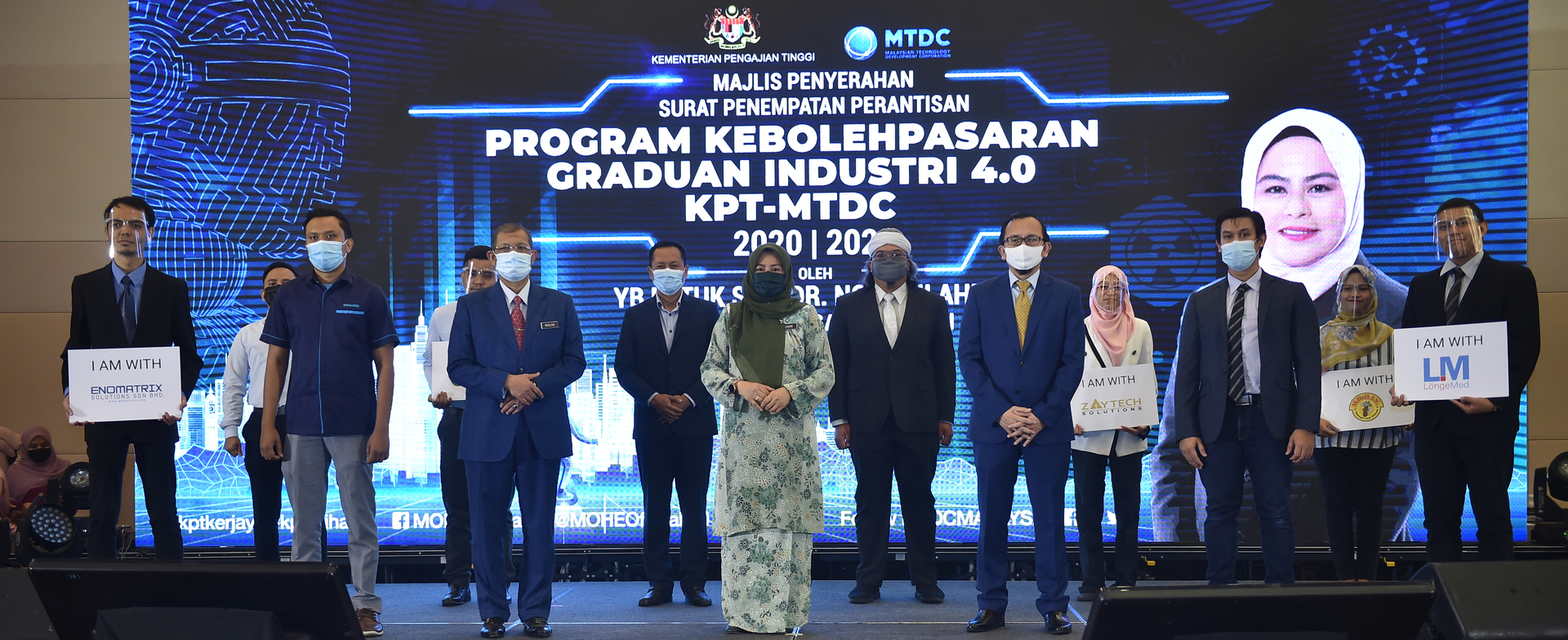 YB Datuk Seri Dr. Noraini Ahmad, Menteri Pengajian Tinggi telah menyempurnakan Majlis Penyerahan Surat Penempatan Perantisan Program Kebolehpasaran Graduan Industri 4.0 KPT-MTDC 2020/2021 di Hotel Tenera, Bangi, hari ini.