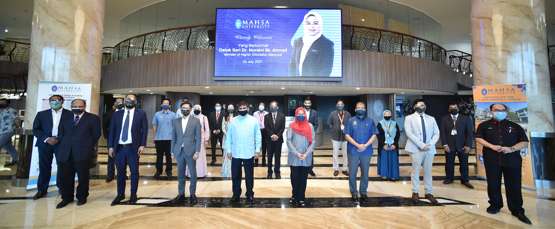 Turut hadir ialah YBhg. Prof Tan Sri Datuk Dr Hj Mohamed Haniffa Hj Abdullah, Pengerusi Eksekutif MAHSA University, YBhg. Datuk Seri Dr. Mazlan Yusoff, Ketua Setiausaha KPT, YBhg. Datuk Rosli Yaakub, Timbalan Ketua Setiausaha (Pengurusan dan Pembangunan), YBhg. Prof. Dato' Dr. Husaini Omar, Ketua Pengarah Pendidikan Tinggi dan Prof. Datuk Dr. Mohammad Shatar Sabran, Ketua Pegawai Eksekutif, Agensi Kelayakan Malaysia (MQA).