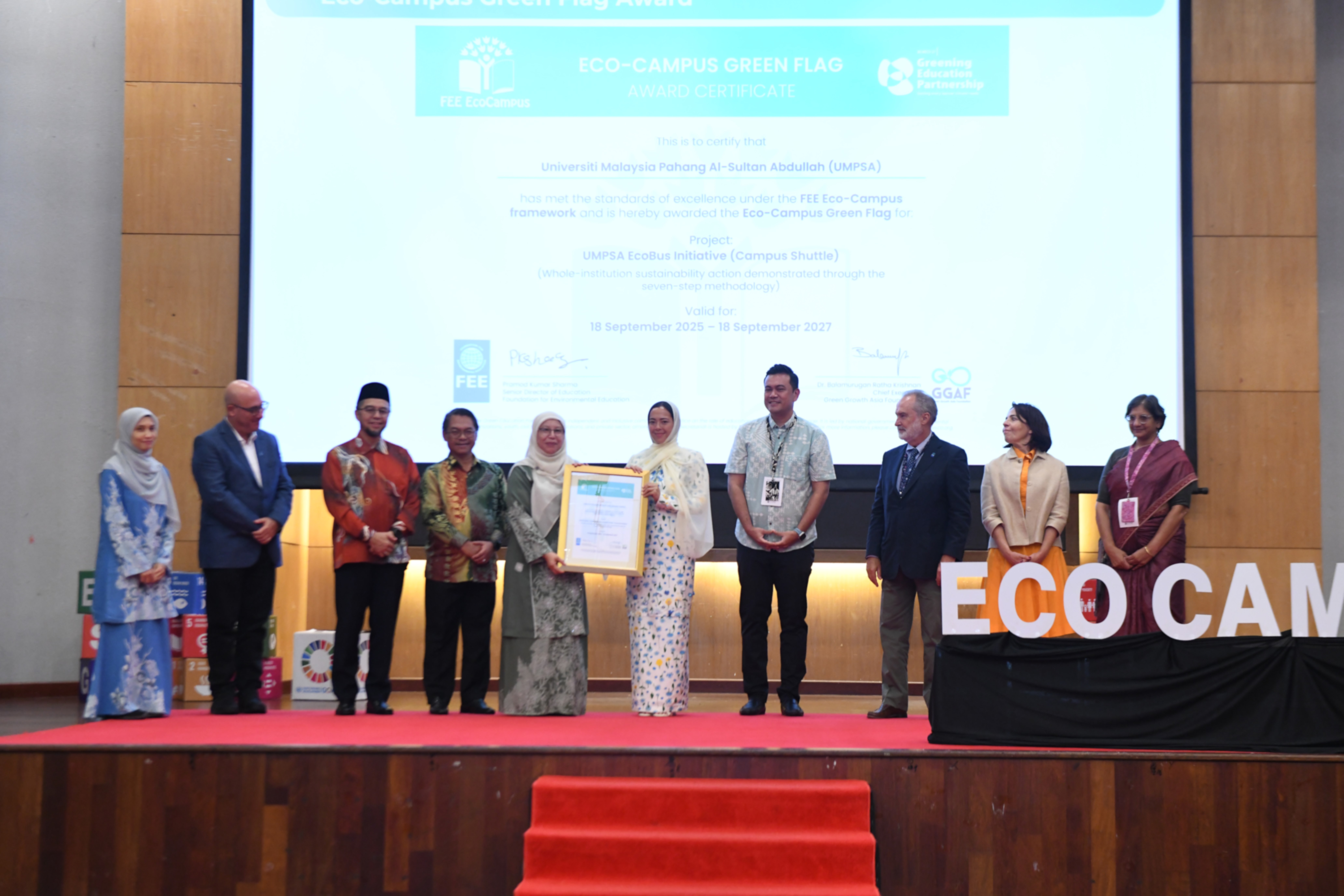 Universiti Malaysia Pahang Al-Sultan Abdullah (UMPSA) muncul sebagai Institusi Pendidikan Tinggi (IPT) pertama di Malaysia menerima pengiktirafan antarabangsa EcoCampus Green Flag pada Persidangan Antarabangsa Eco-Campus (ECIC) 2025 di ibu negara semalam.